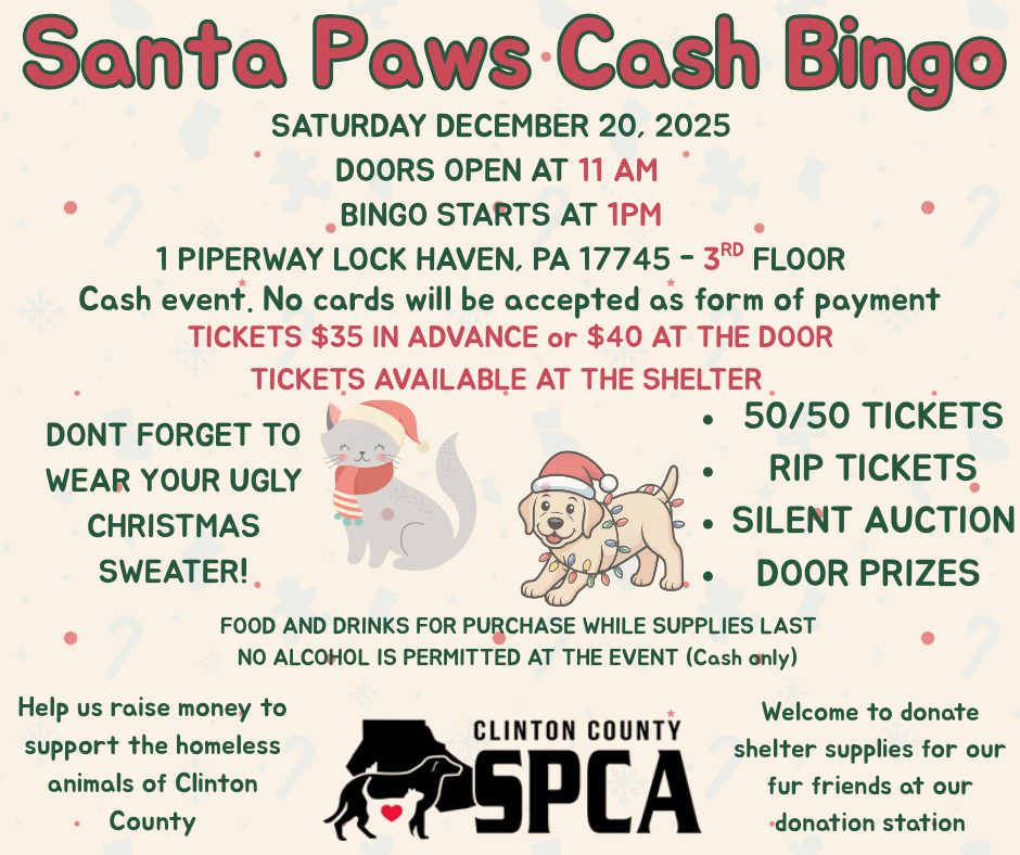 Piper Aviation Museum 1 Piperway, Lock Haven, PA, United StatesCash Bingo with rip tickets, silent auction, food and snacks for purchase, door prizes. Doors open at 11 Bingo starts at 1. We will have a pet showcase that displays adoptable friends, there will be a donation station for laundry soap and cat litter however all donations are welcome. All benefits the Clinton County SPCA.